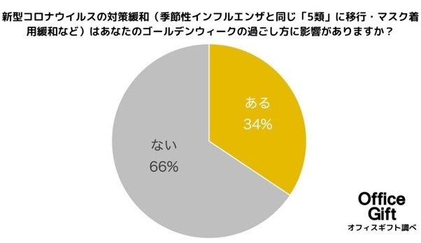 「新型コロナウイルスの対策緩和(季節性インフルエンザと同じ「5類」に移行・マスク着用緩和など)はあなたのゴールデンウィークの過ごし方に影響がありますか?」という設問に対し、3割以上の人が「ある」と回答する結果に。