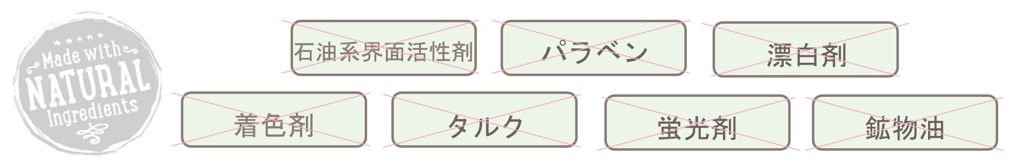 * 石油系界面活性剤、パラベン、着色剤、鉱物油、漂白剤、光沢剤、タルクすべて無添加