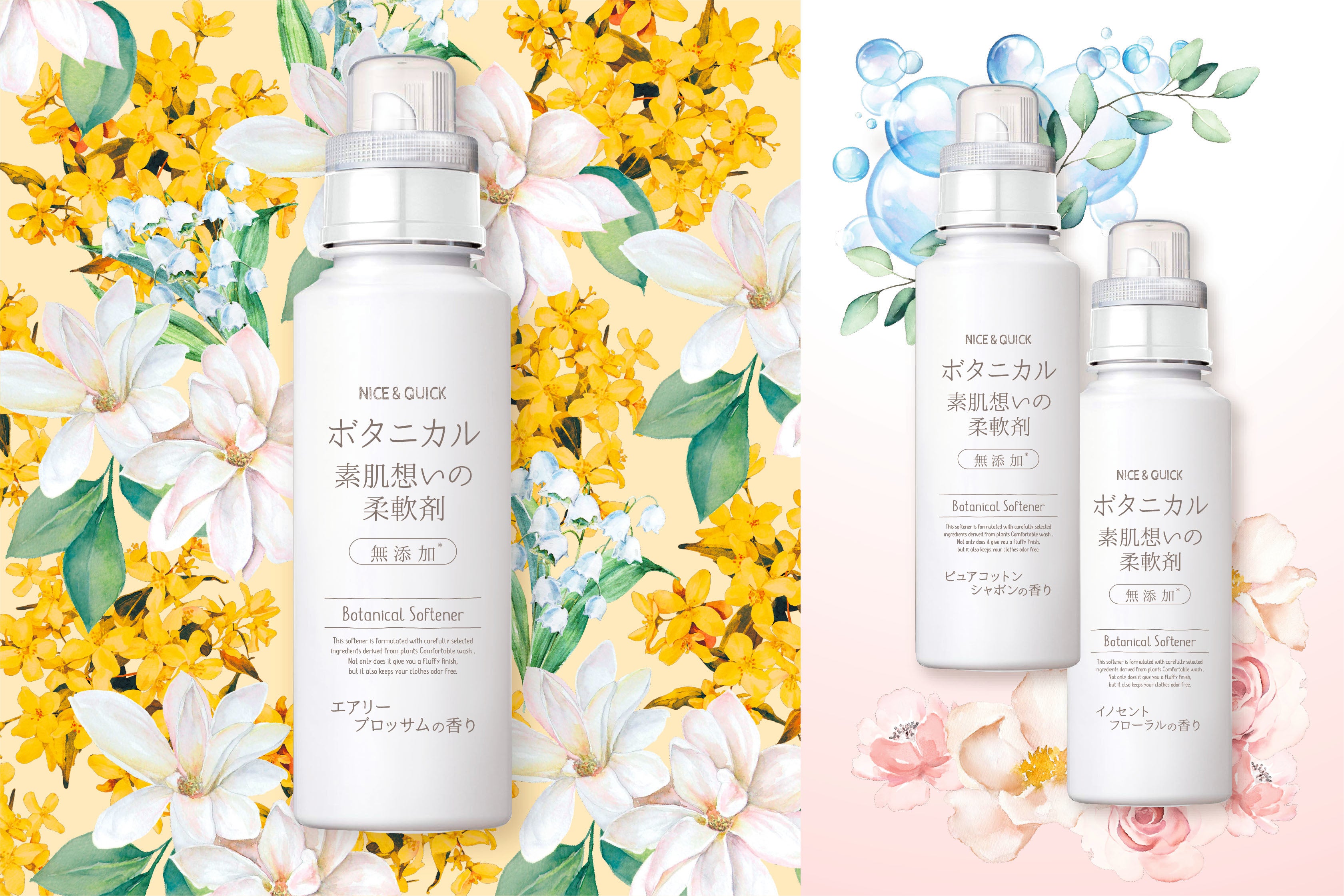 左からナイス&クイック ボタニカル 素肌想いの柔軟剤 エアリーブロッサムの香り、ピュアコットン
