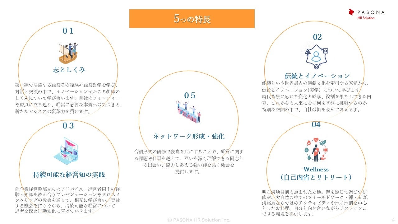 この合宿は、単なる経営スキルの習得にとどまりません。横浜市立大学大学院国際マネージメント学科 客員教授 竹林一氏や、日本オラクル初代代表のアレン・マイナー氏、株式会社パソナグループ 取締役副社長執行役員 山本 絹子氏等の豪華講師陣から、イノベーションが自走する組織の「しくみ」と、その根幹となる経営哲学を深く学びます。自社の原点に立ち返ることで、経営者としての軸と、未来を切り拓く変革力を養います。