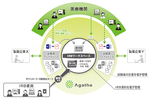 「Agatha IRB(IRBワークスペース)」では、IRB資料の管理・電磁的保管を行います。IRB委員への配布、IRBのオンライン開催にも利用できます。
