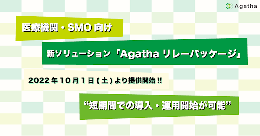 治験・臨床研究クラウドサービス「Agatha(アガサ)」を提供するアガサ株式会社(本社:東京都中央区、代表取締役社長:鎌倉 千恵美、以下 アガサ)は、医療機関・SMO向けにパッケージ型の新ソリューション「Agathaリレーパッケージ」を2022年10月1日(土)より提供開始いたします。