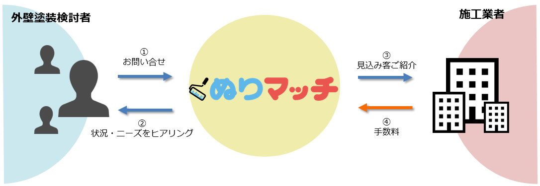 『ぬりマッチ』は、外壁塗装等の検討者と施工会社をマッチングするサイトです。外壁塗装等の検討者は、無料で複数の施工会社から見積価格を比較できます。一方、外壁塗装等の施工会社は、外壁塗装検討者からの工事見積もり依頼(見込客)を成果に連動した料金体系で効率的に獲得することができます。
