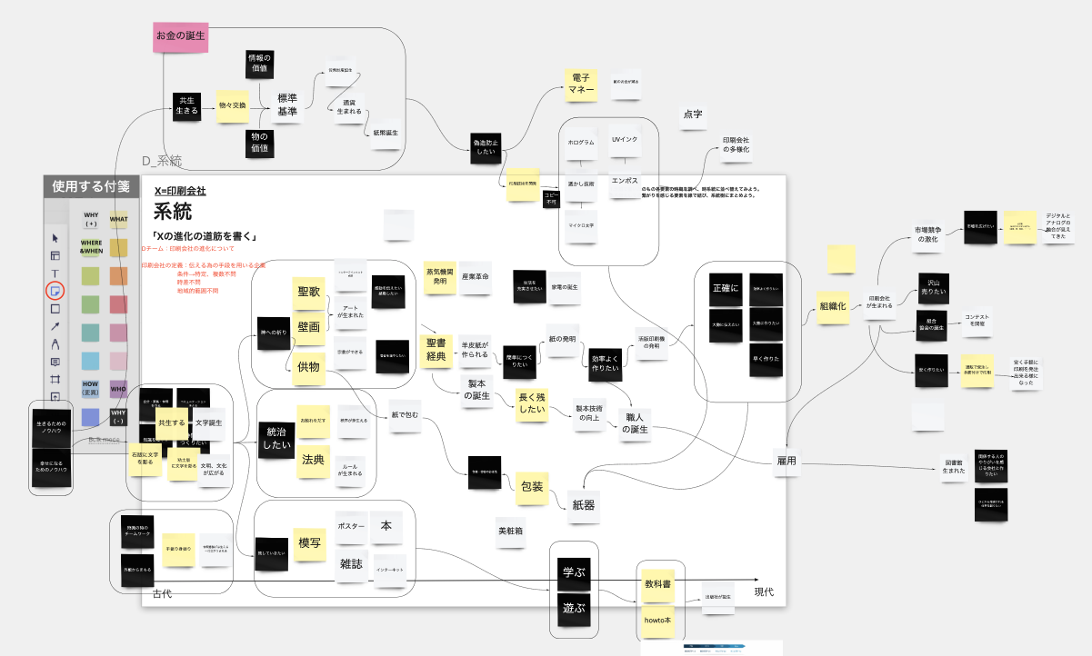参加者は5つのチームに分かれ、「印刷会社」「印刷機」「本」という3つのテーマから割り当てられた対象を「進化」させることが設定されました。各チームで印刷環境を取り巻く生態マップと系統樹をオンラインホワイトボード「miro」を用いて書き込み、2030年の印刷業界における最高のシナリオ、最悪のシナリオをそれぞれ描き出すワークが行われました。