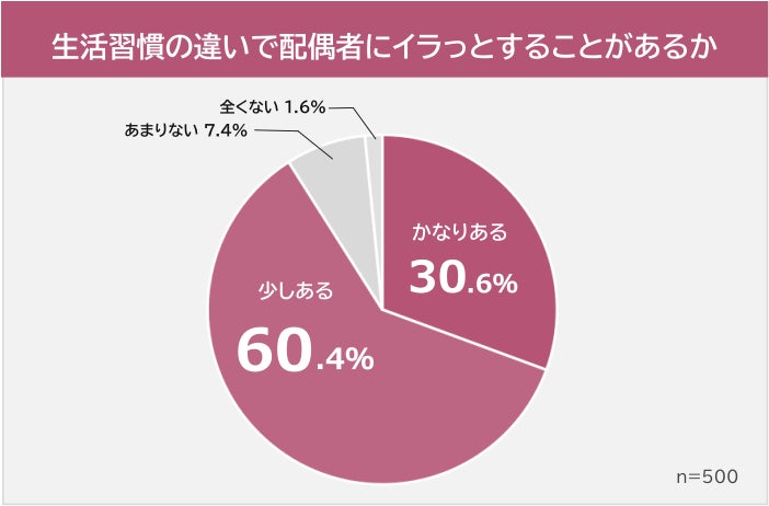 既婚男女500人に「結婚生活で配偶者との生活習慣の違いにイラッとすることがあるか」を聞いたところ、「ある」と回答した人が「かなり(30.6%)」「少し(60.4%)」を合わせて91.0%となりました。結婚生活では、「配偶者との生活習慣の違い」がストレスにつながる可能性が、かなり高いことがわかります。