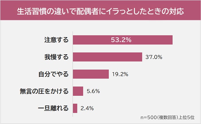 「生活習慣の違いで配偶者にイラッとしたときどうするか?」という問いには、「注意する(53.2%)」と回答した人が全体の半数以上にのぼりました。2位「我慢する(37.0%)」となっています。