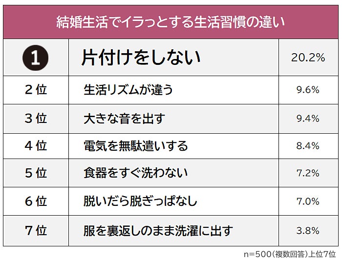 【結婚生活でイラッとする生活習慣の違いランキング】既婚男女500人アンケート調査