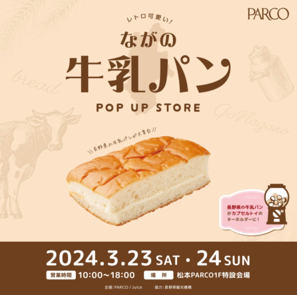 一般社団法人長野県観光機構(本部:長野県長野市・理事長:野原 莞爾)と株式会社Juice(本社:東京都豊島区・代表取締役:神戸 輝男)は、長野県のご当地パン『牛乳パン』をモチーフにしたカプセルトイ『レトロ可愛い!ながの牛乳パン』を2024年3月23日より発売いたします。発売記念イベントとして松本パルコにてPOP UP STOREを開催し、カプセルトイのモチーフとなった牛乳パンの販売も実施します。
