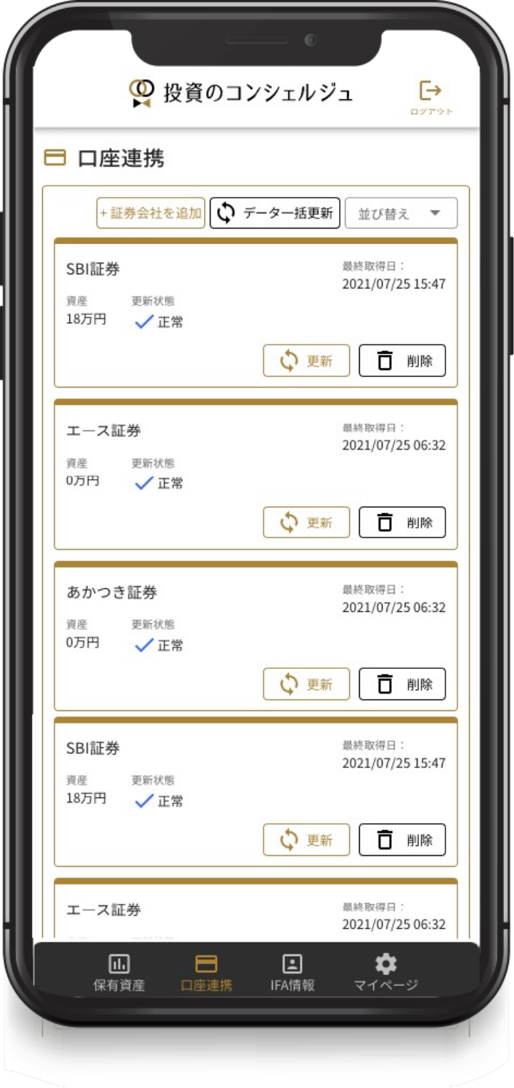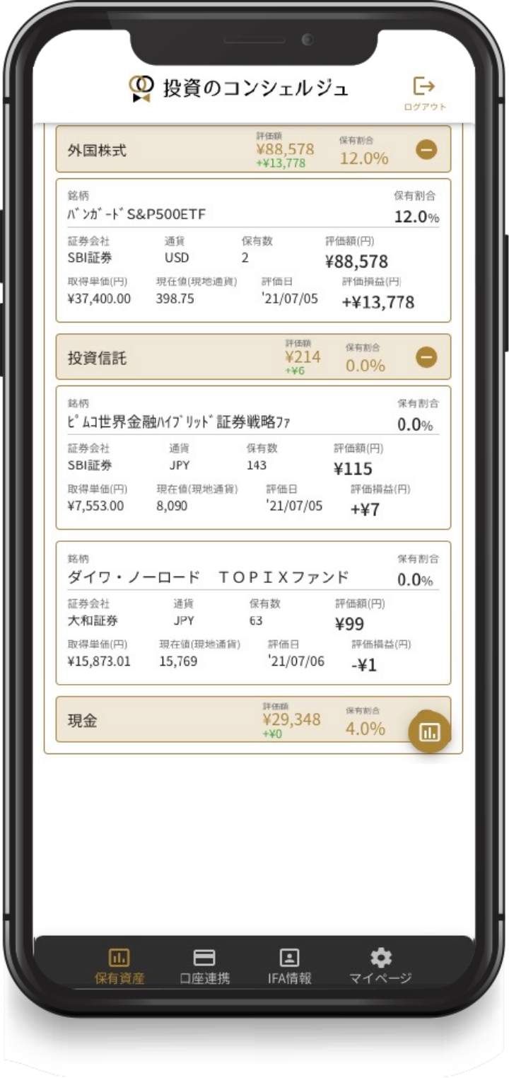 投資銘柄ごとの時価や取得原価、保有数などを取得することで資産残高や損益情報を、一元的に表示します。