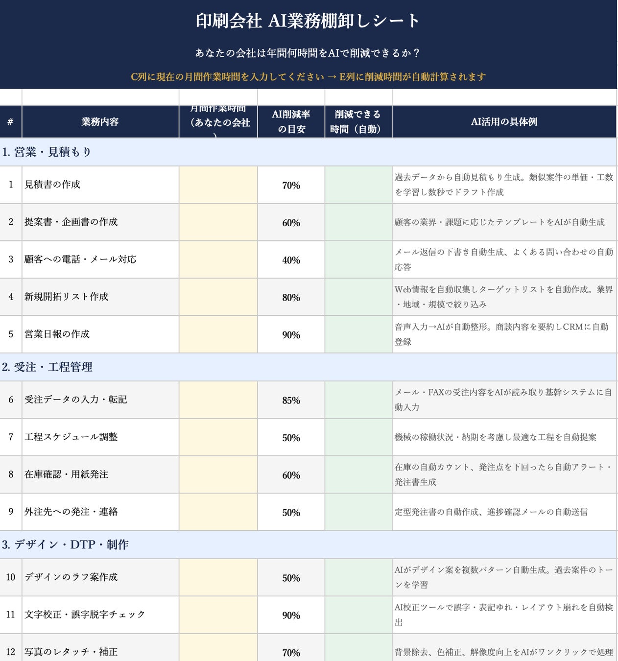 AI導入で年間80時間の業務削減を実現した印刷会社の事例を公開。参加特典として「AI業務棚卸しシート」を配布
