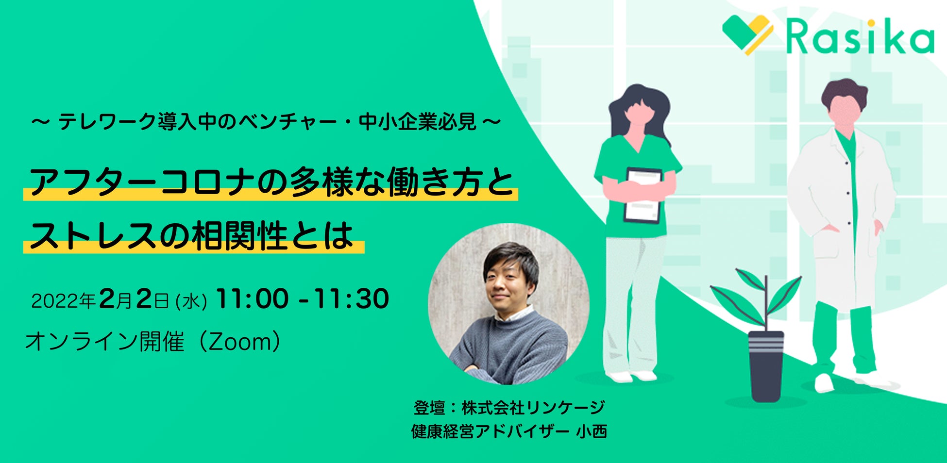 予防医療テックで職域向けにオンライン診療など健康支援プログラムを提供する株式会社リンケージ(本社:東京都中央区、代表取締役社長:生駒恭明)は、2022年2月2日(水)11時より、無料ウェビナー「〜テレワーク導入中のベンチャー・中小企業必見〜 アフターコロナの多様な働き方とストレスの相関性とは」を開催します。