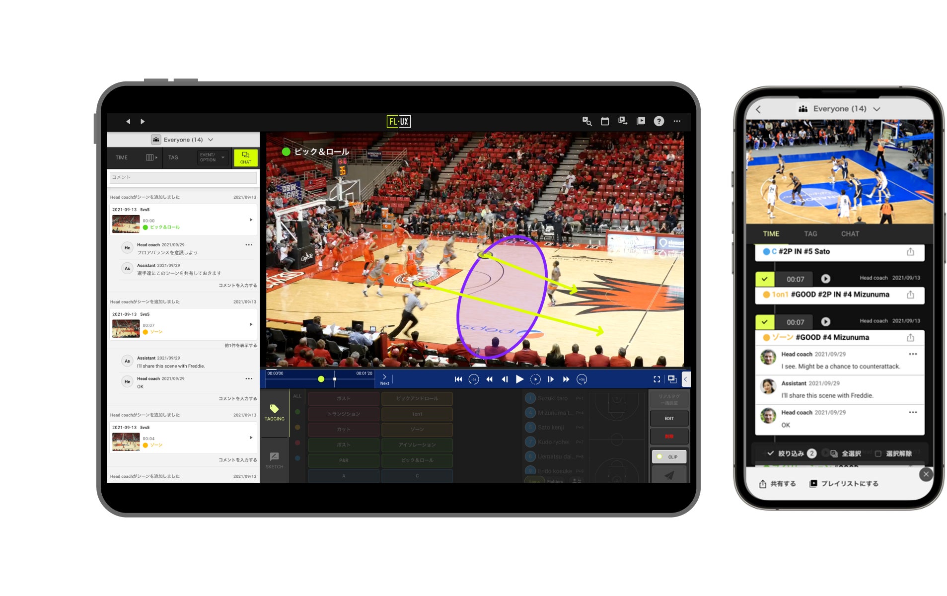 FL-UXは、プロ・アマチュアチームを含めた280チーム以上に導入している、LIVE映像を活用したリアルタイムフィードバックで選手育成とチーム強化に貢献する、映像分析・コミュニケーションアプリです。