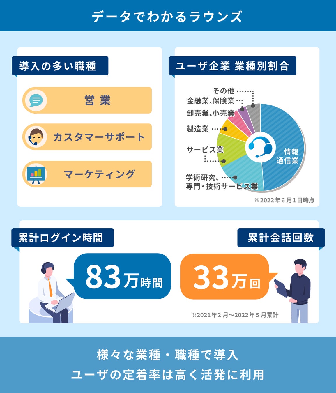 roundzはローンチ以来導入社数を積み上げ、中小企業やスタートアップを中心に上場企業を含めた様々な企業へ導⼊されています。サービスローンチ以来の累計ログイン時間は83万時間、会話回数は33万回にも上り、導入企業における定着率は高く活発に利用されています。