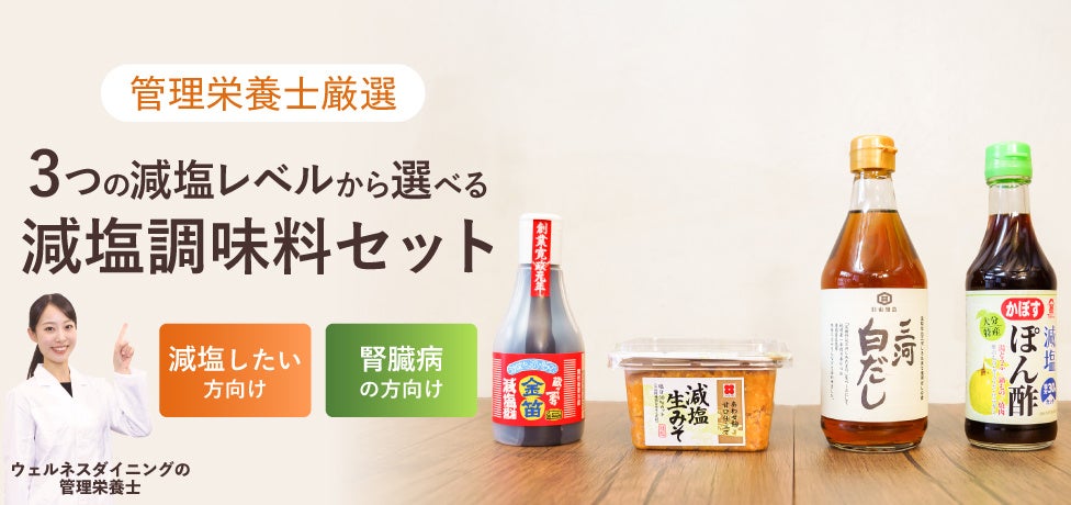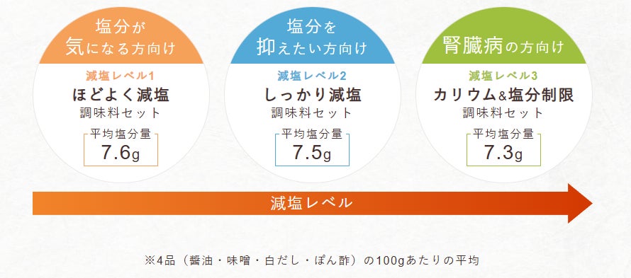 醤油・味噌・白だし・ぽん酢の4点がセットになっており、3つの減塩レベルから選ぶことができます。