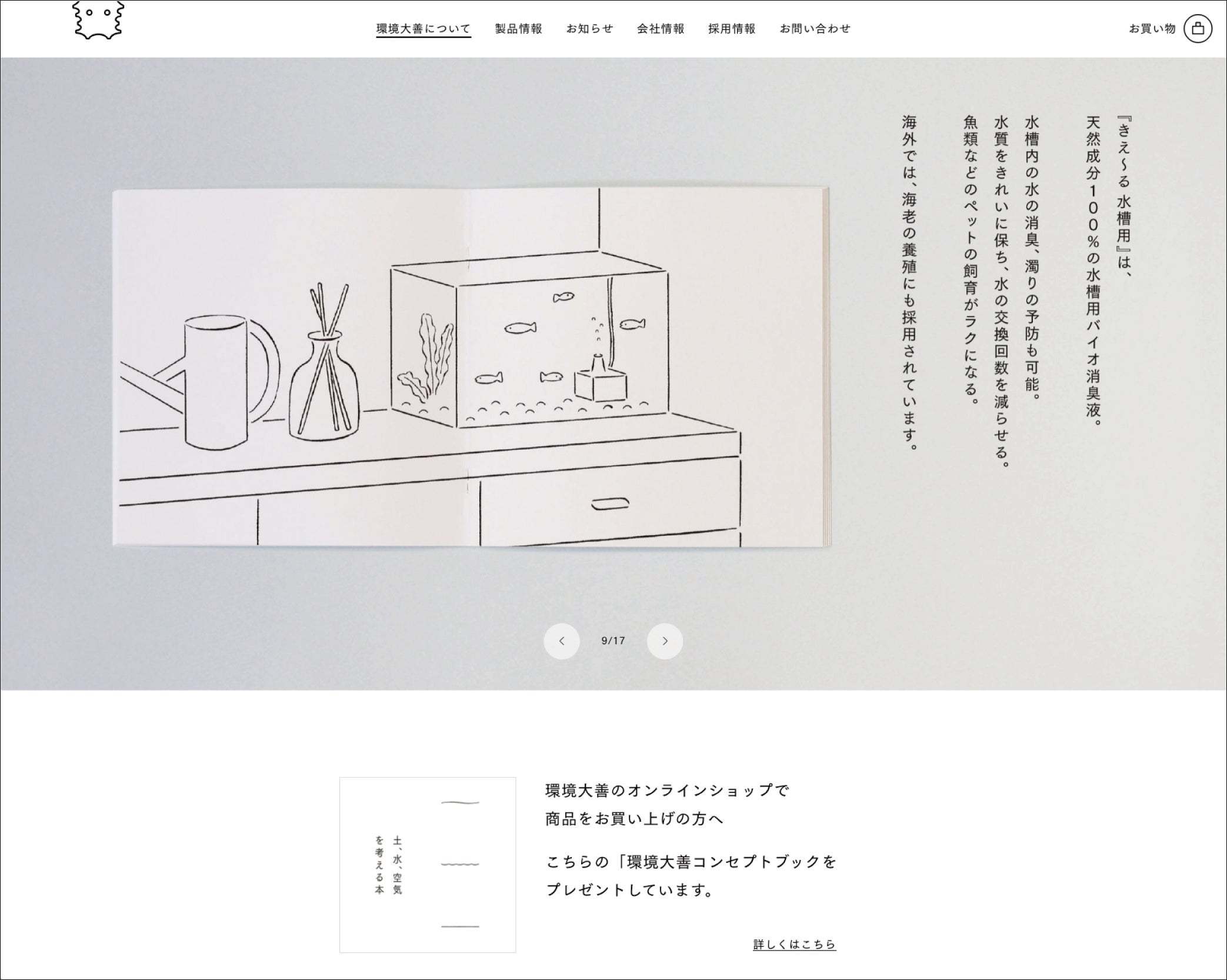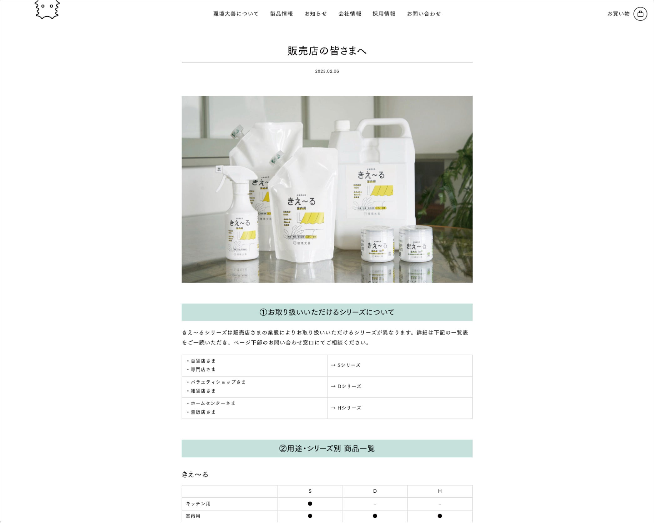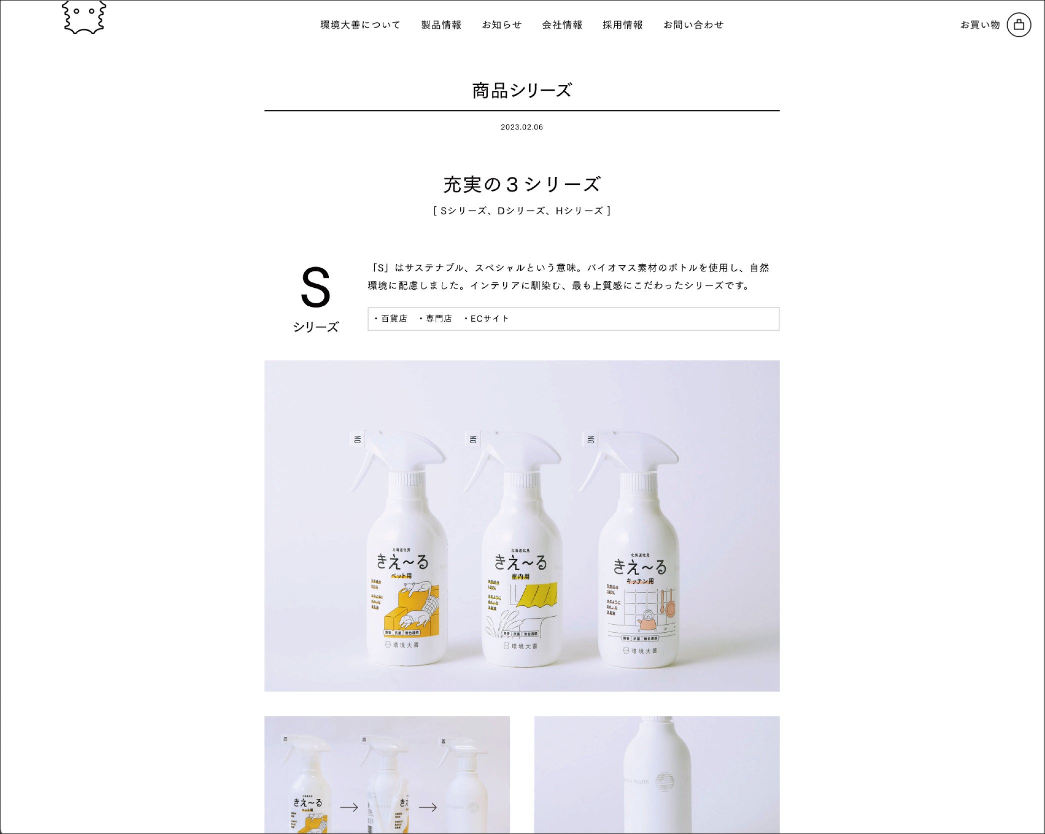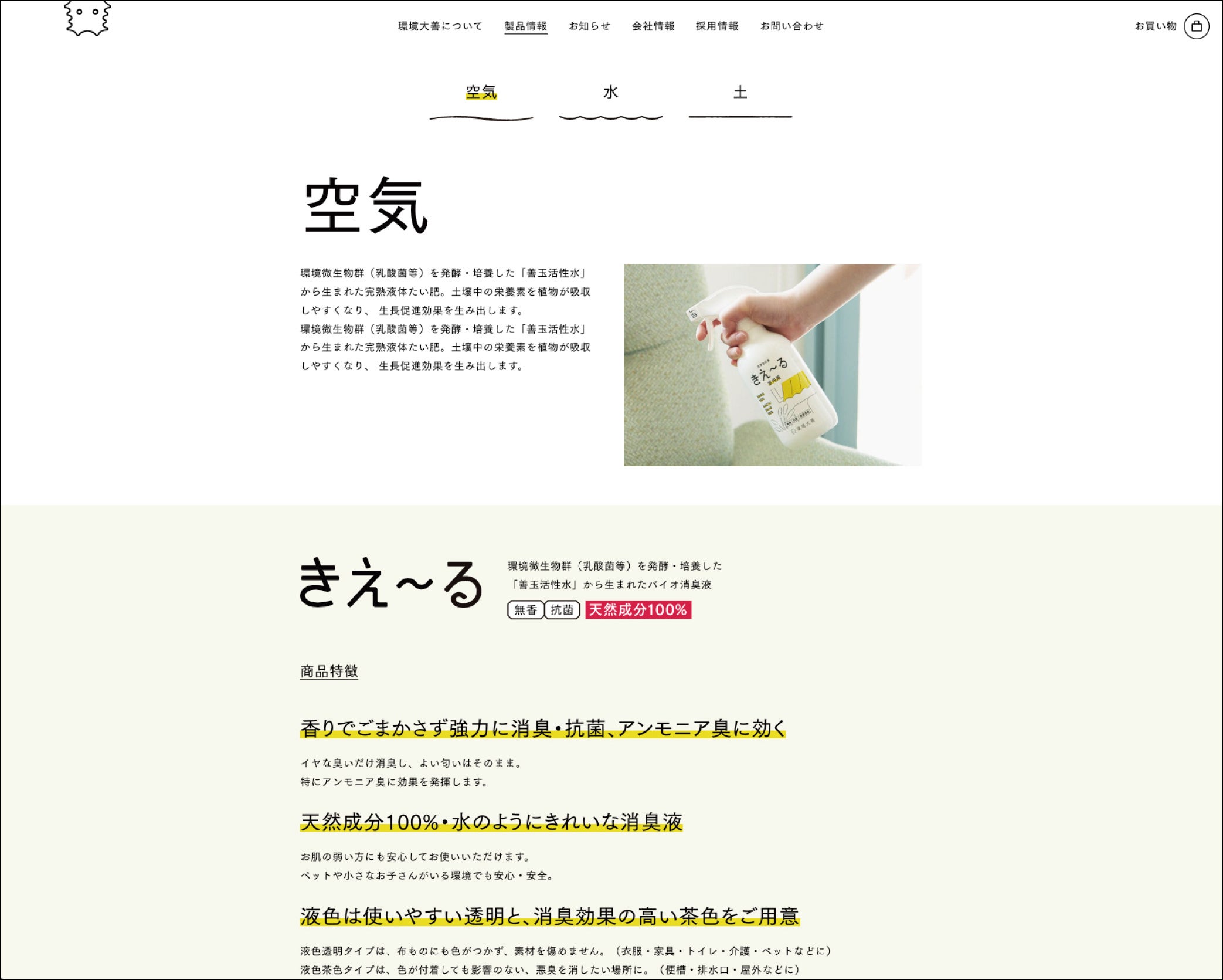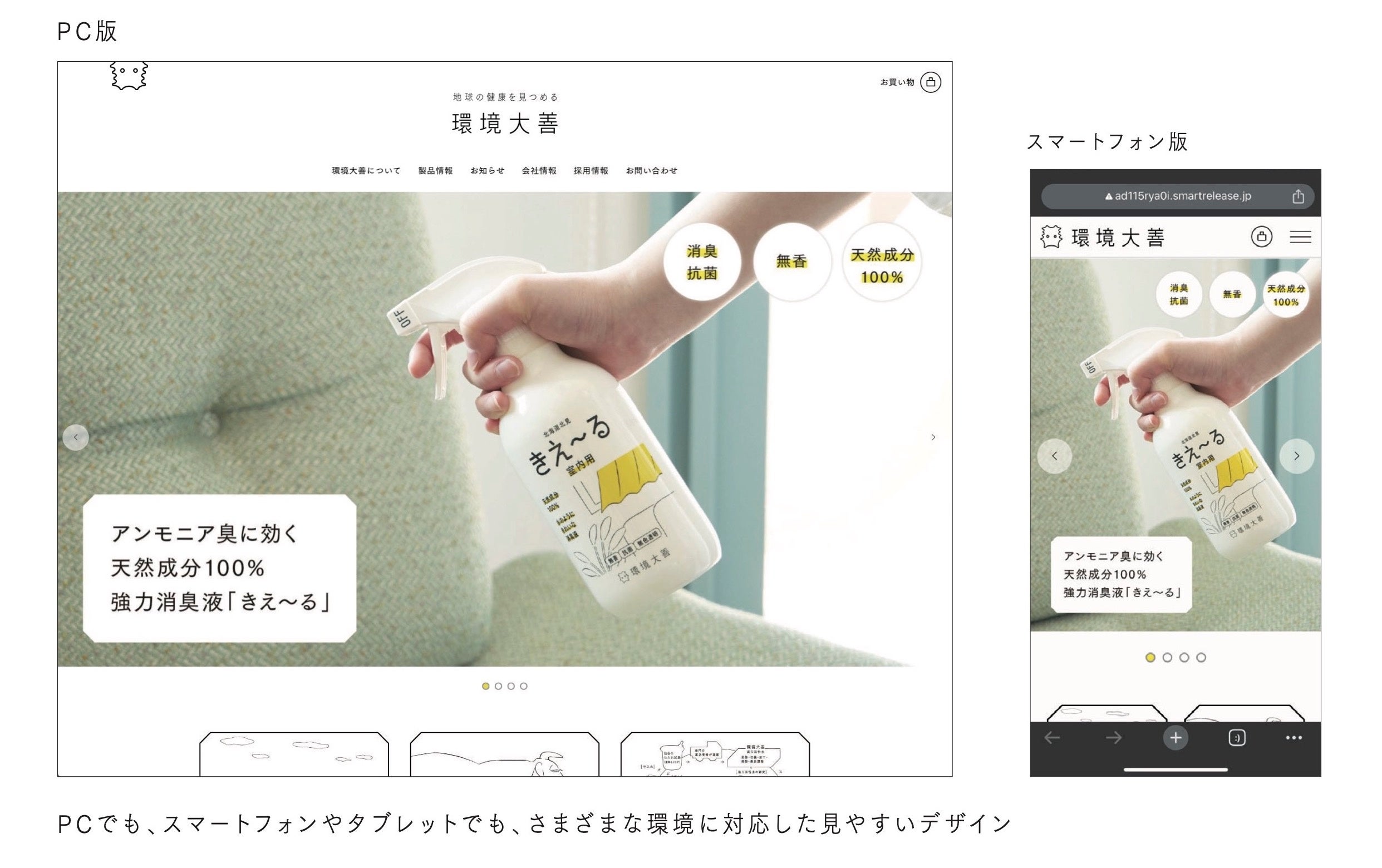 会社、商品の情報にアクセスしやすいように再構成した上で、パッケージデザインと連動性のある画面デザインになっています。また、環境大善の日々アップデートされる情報をスムーズに更新できるように運用しやすいウェブサイトを目指しました。
