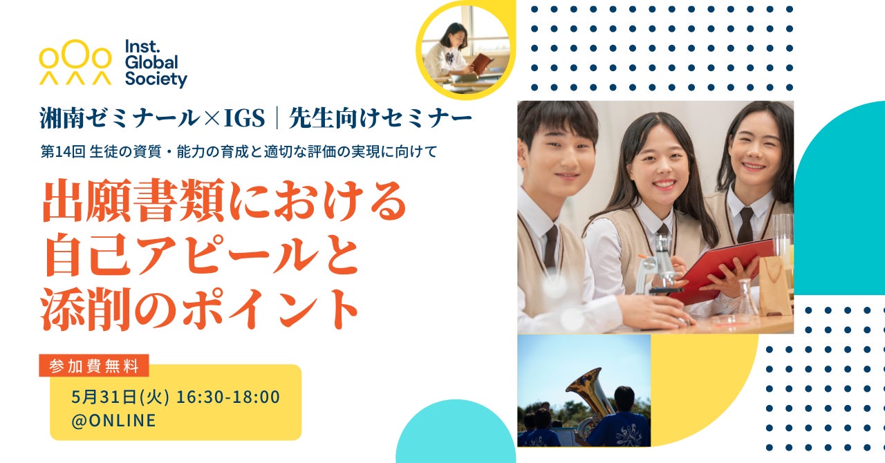 湘南ゼミナール 高等部、総合型選抜(AO)・推薦コース責任者の川村一雄氏を講師にお招きします。「総合型・学校推薦型選抜の出願書類における自己アピールを通じ、生徒の自尊感情を育む」をテーマにご講演いただく他、IGS 執行役員 教育事業部長 矢部一成と対談致します。学校の先生・学校関係者向けのオンラインセミナーとなっており、参加費は無料です(事前登録制)。
