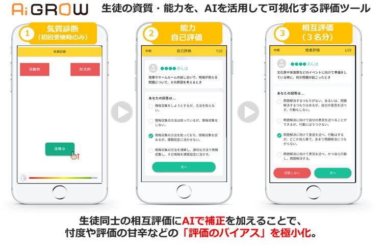 児童・生徒・学生の資質・能力と、教育効果を可視化する、教育機関向け評価ツールです。潜在的な性格診断(IAT)の他、能力評価の際に生徒の相互評価にAIの補正を加えることで、評価バイアスを極小化。資質・能力を定量化し、即時フィードバックが可能です。