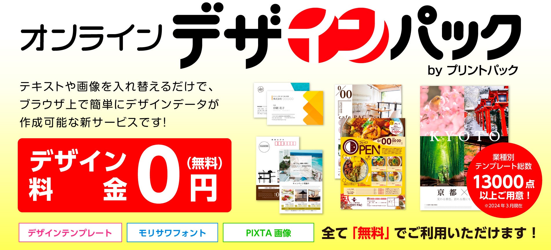プリントパックは開設以来、デザインデータをネットでご入稿いただくだけで、「高品質な印刷物を誰もが手軽にご利用いただける低価格でご提供する」ことを使命にコストダウンを重ねてきました。昨今、「デザインも一括サポートできないか」との多くのお声をいただき、「デザインを、もっと手軽に」を目指して、この度「オンラインデザインパック」を新たにスタートしました。