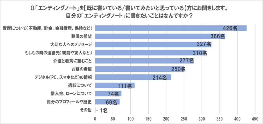 | 「エンディングノート」に書きたい内容は、 1位「資産について」、2位「葬儀の希望」、3位「大切な人へのメッセージ」が上位にのぼり 自分の死後、遺された人に配慮した内容が多い |