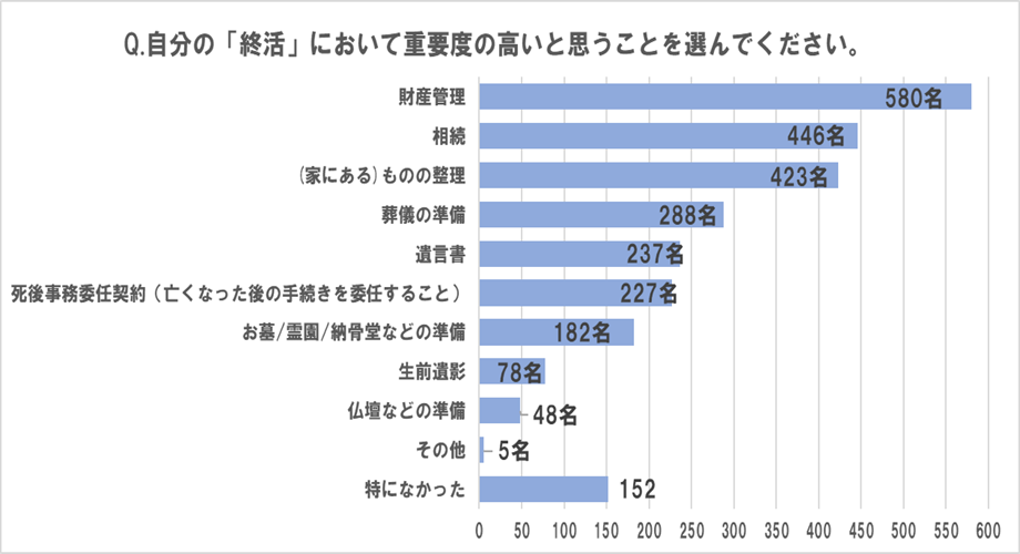 ■「終活」で重要と思うことは、1位「財産管理」58%、2位「相続」45%、3位「ものの整理」42%