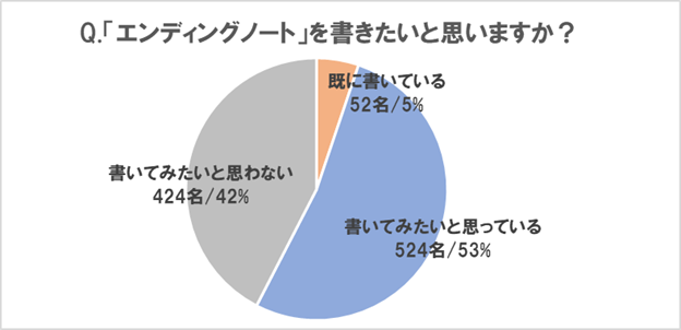 | 「エンディングノート」の認知度80%に比べ、「既に書いている」人は5%と低い 「書いてみたいと思っている」人は53%と関心度は高い |