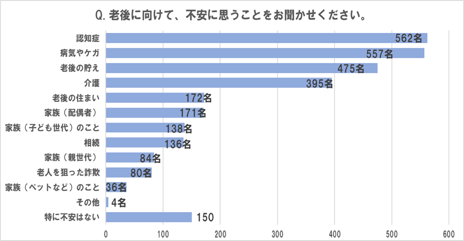 ■具体的な老後への不安は、1位「認知症」56%、2位「病気やケガ」48%、3位「老後の貯え」48%