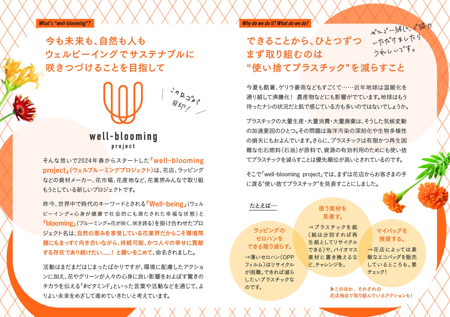 「well-blooming project(ウェルブルーミングプロジェクト)」とは、世界中で時代のキーワードとされる「Well-being」(ウェルビーイング=心身が健康で社会的にも満たされた幸福な状態)と「blooming」(ブルーミング=花が咲く、咲き誇る)を掛け合わせた言葉。自然の恵みを享受している花業界だからこそ、環境問題にもまっすぐ向き合いながら、持続可能、かつ人々の幸せに貢献する存在であり続けたい、という願いをこめて命名しました。