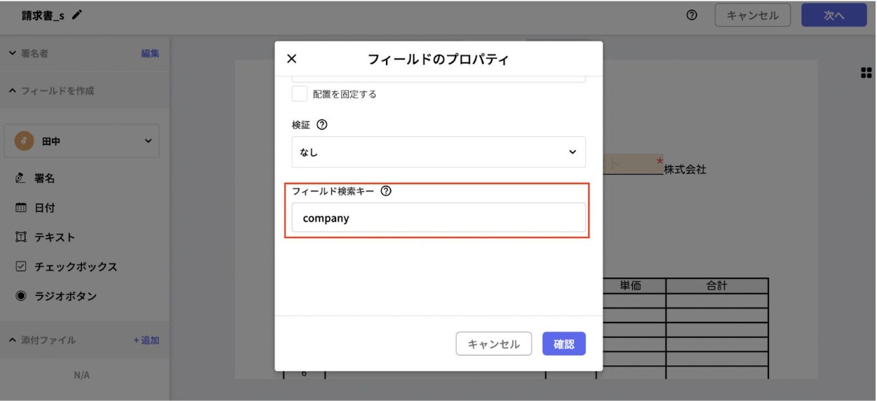 ※フィールド検索キーを利用するには、事前に設定をする必要があり、すでに署名が完了しているドキュメントにはフィールド検索キーはご利用いただけません。