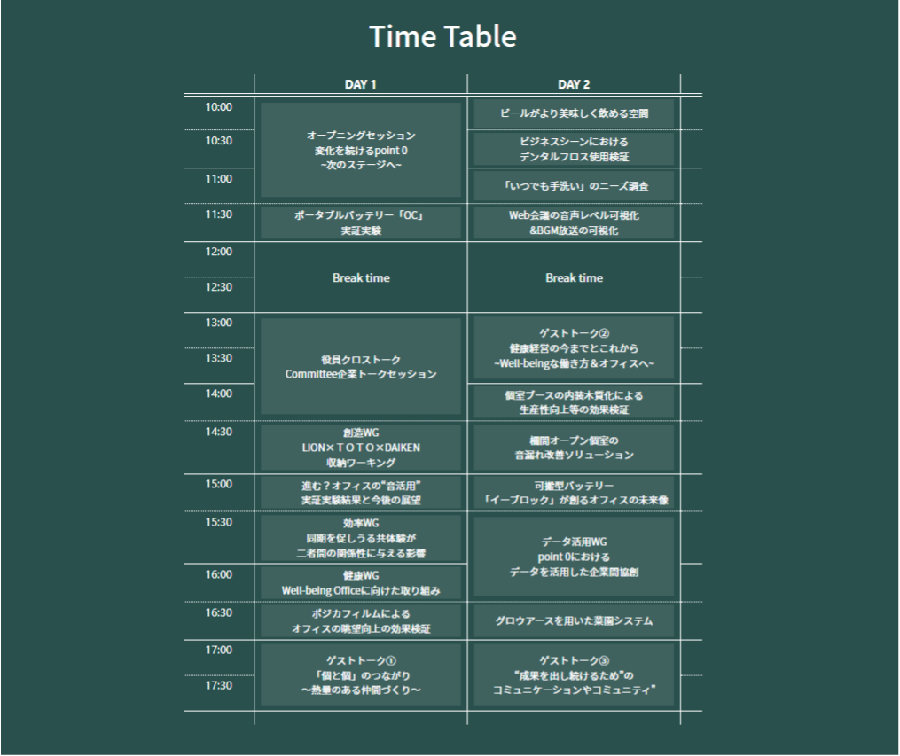 point 0の今後の展開をはじめ、各界の最前線で活躍される方々をお招きしイノベーションや協創/共創のヒントとなるコンテンツをお届けするゲストトークセッション、point 0 committee企業の役員クロストークやこれからの働き方の新たな価値検証に取り組んだ様々な実証実験の結果報告など様々なセッションをお届けいたします。