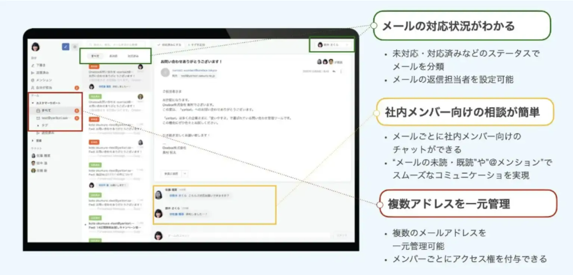「yaritori」は、複数人でのメール対応をかんたんにするクラウド型のメールサービスです。メールの対応状況(未対応・対応済みなど)をチーム内で可視化し、メール対応の効率化を実現することができます。