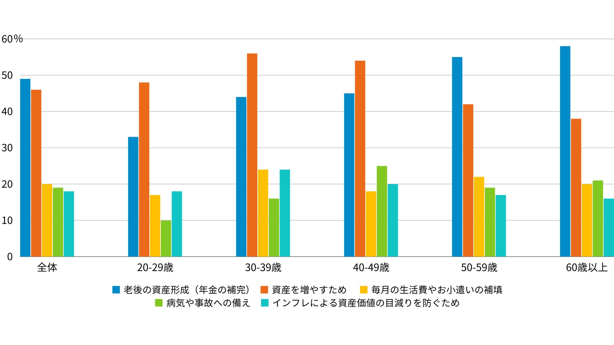 ・NISA利用の目的は「老後の資産形成」がトップ、若年層では多くの人が投資するものを選ぶ傾向