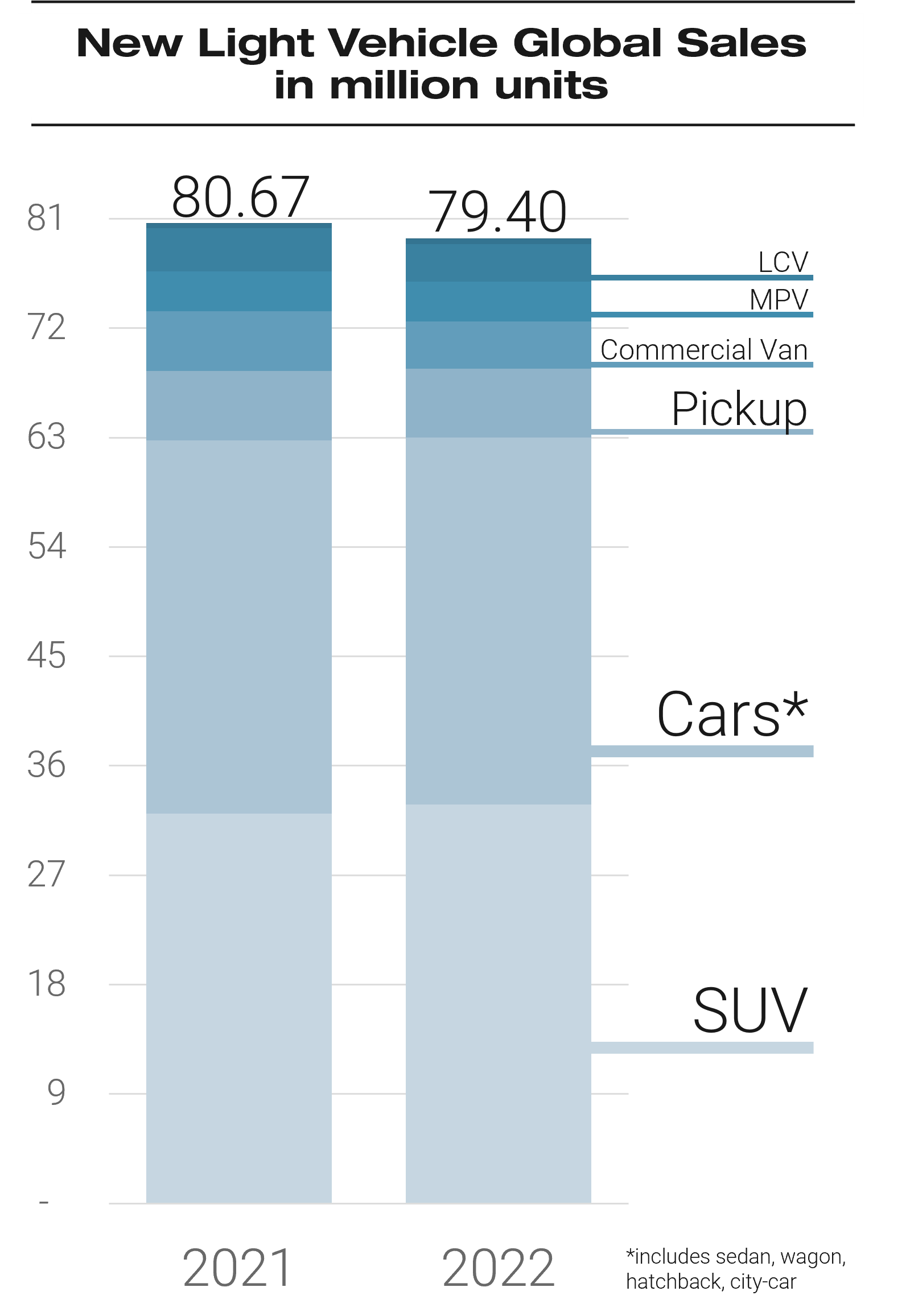JATO Dynamicsのデータによると、2022年の世界の新車販売台数は7,940万台となり、2021年の8,070万台から2%減少した。世界販売台数の24%を占める新興国市場(インド、中東、東南アジア、アフリカ)での好調ぶりは、北米、欧州、中国の減少を相殺するほど大きなものであった。