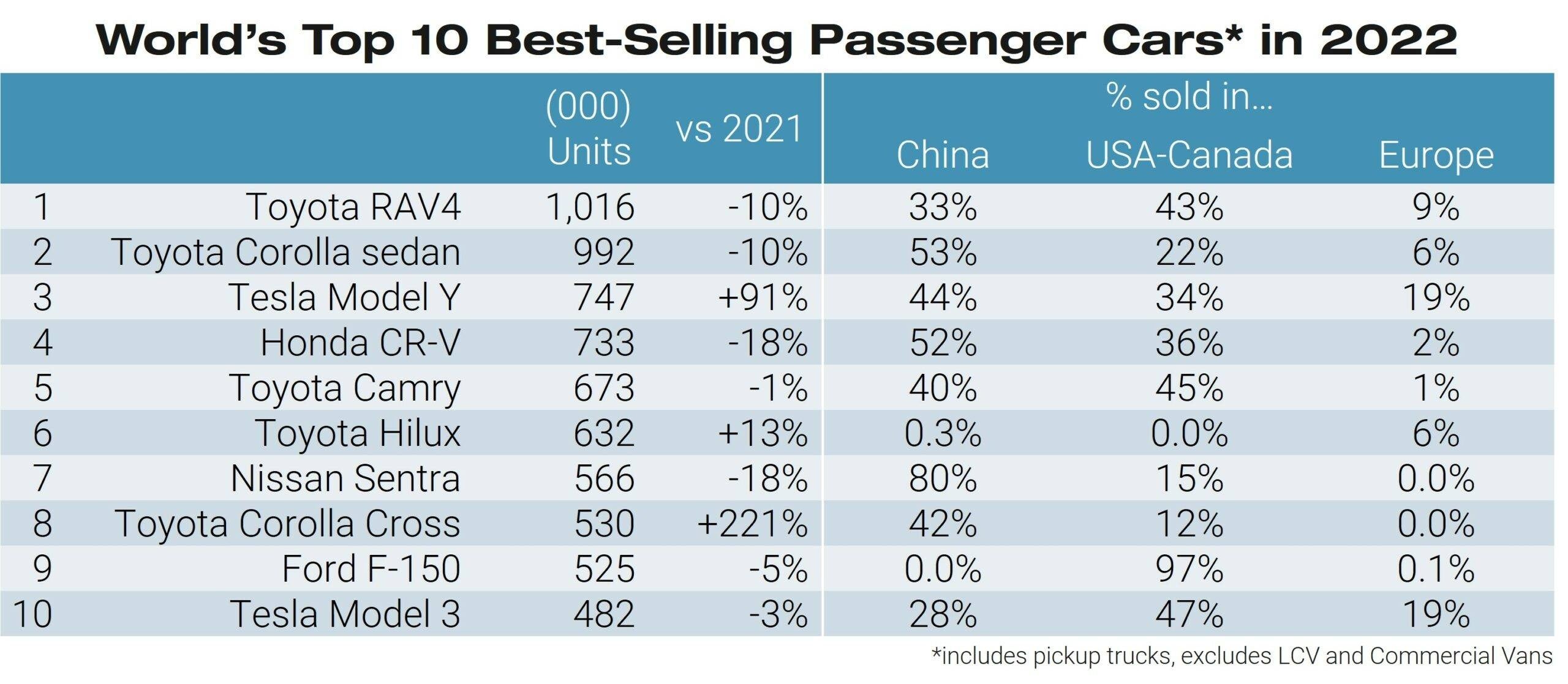 テスラは、2022年に発売していた4モデルのうち、2モデルをトップ10にランクインさせた。JATOの53カ国のデータと、さらに95カ国の調査・推定によると、テスラ モデル Yは2022年に世界で3番目に売れた乗用車となり、従来から販売首位の常連であるトヨタRAV4とトヨタ カローラ/レビン セダンに続いた。