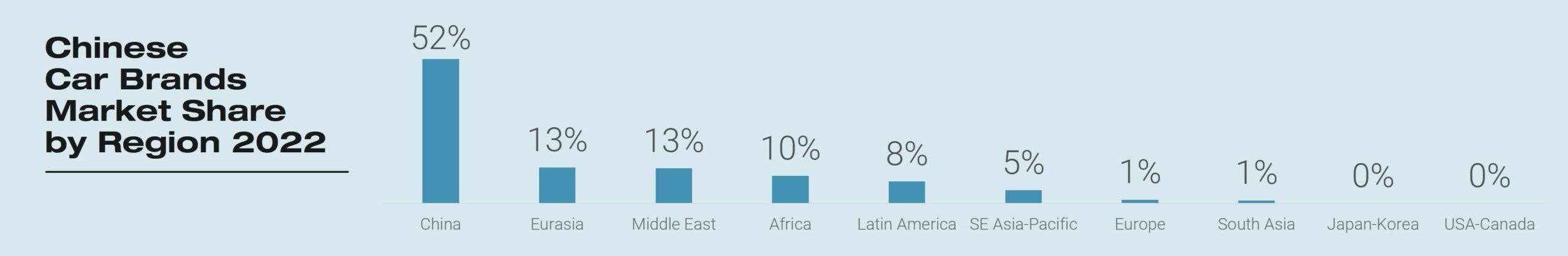 中国メーカーの成長は新興市場でも感じられ、そのマーケットシェアは2021年の4.8%から6.4%に跳ね上がった。これはまだ比較的小さな割合だが、中国メーカーは欧州や韓国の自動車メーカーからシェアを奪うことに成功しているのだ。ユーラシア大陸全体で見ると、中国メーカーのマーケットシェアは、2021年の6.2%から2022年には12.8%と2倍以上になっている。