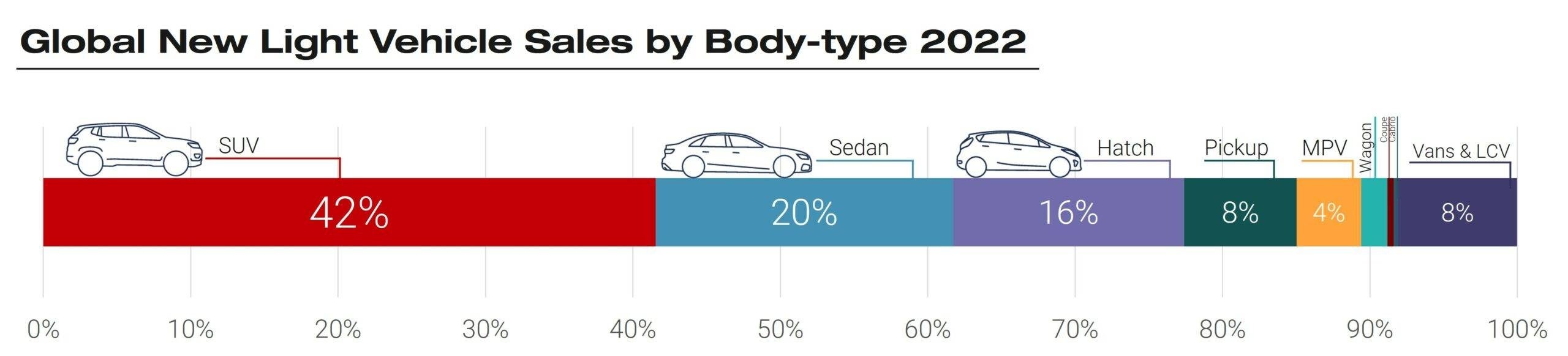 2021年から2022年にかけて市場全体が2%近く減少したにもかかわらず、SUVの販売台数は2.3%増の3,280万台と過去最高を記録した。世界全体でのSUVのシェアは、2021年の39.7%から41.3%に上昇している。