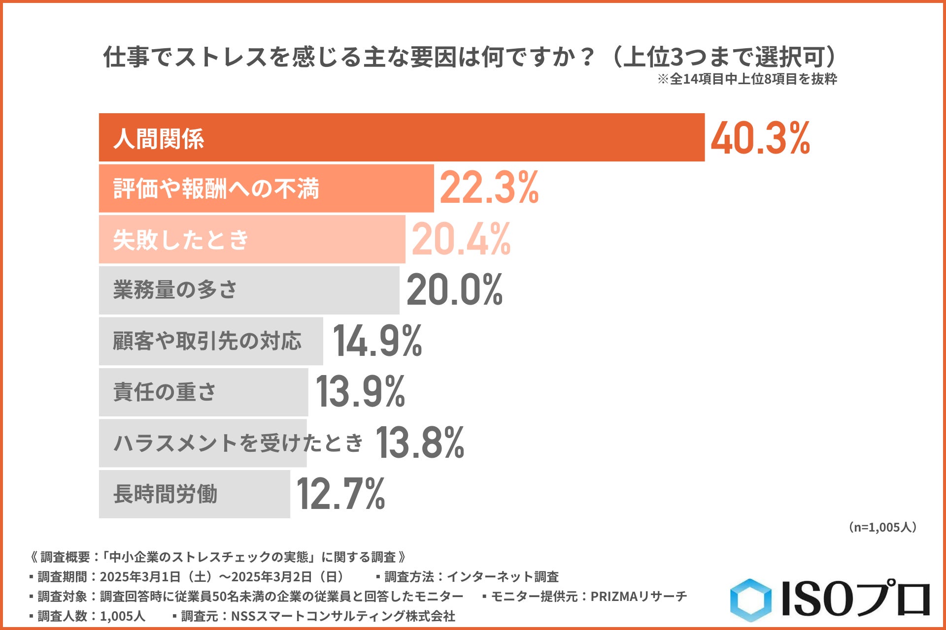 仕事でストレスを感じる主な要因として、人間関係や評価制度への不満、失敗経験などがあげられ、ストレスやパワハラに関する相談窓口が設置されていない会社が多いことも浮き彫りになりました。
