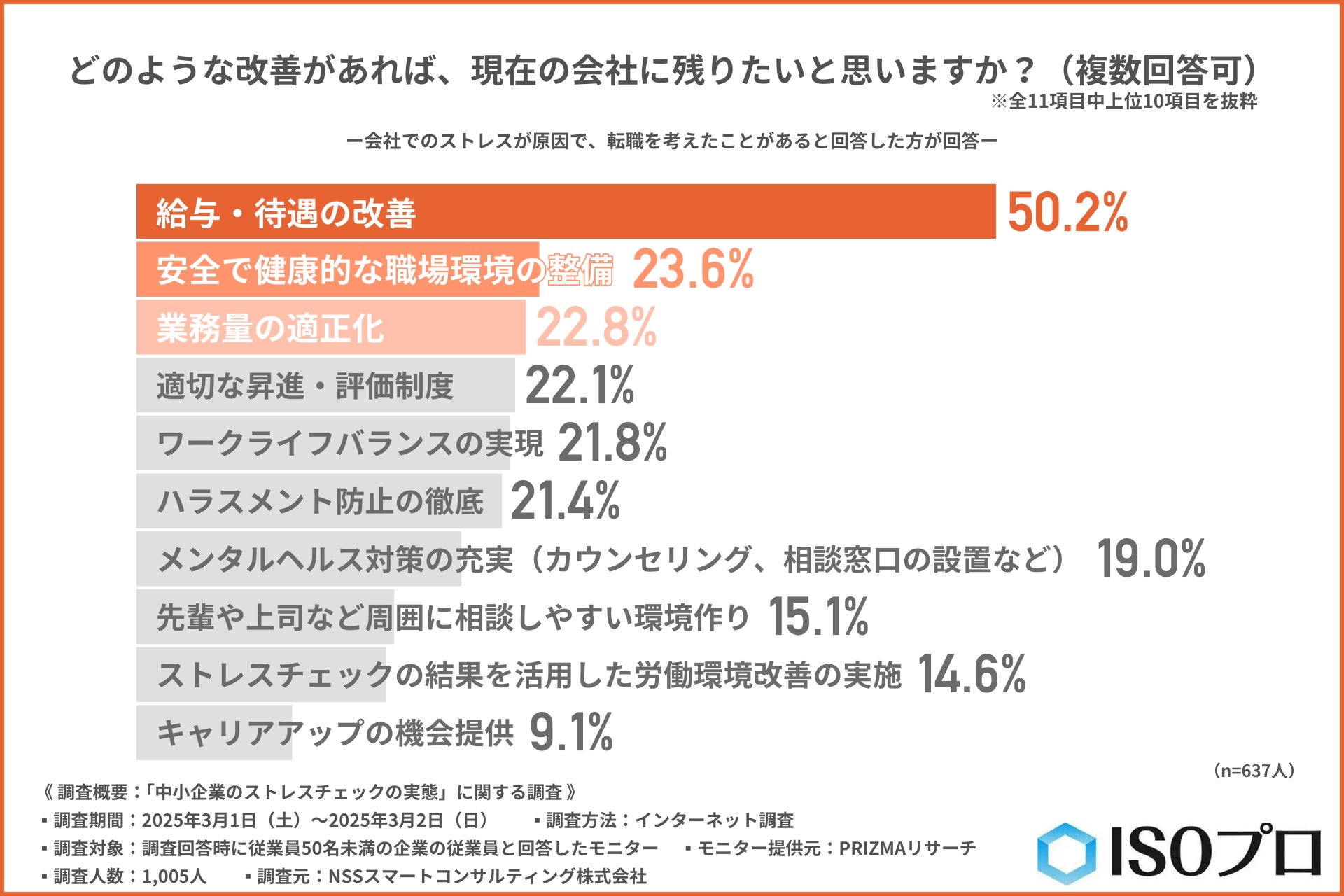 このような背景から、企業側には「給与や待遇の改善」「安全で健康的な職場環境の整備」「業務量の適正化」など、従業員が「会社に残りたい」と思うための具体的な改善策が求められていることもわかりました。