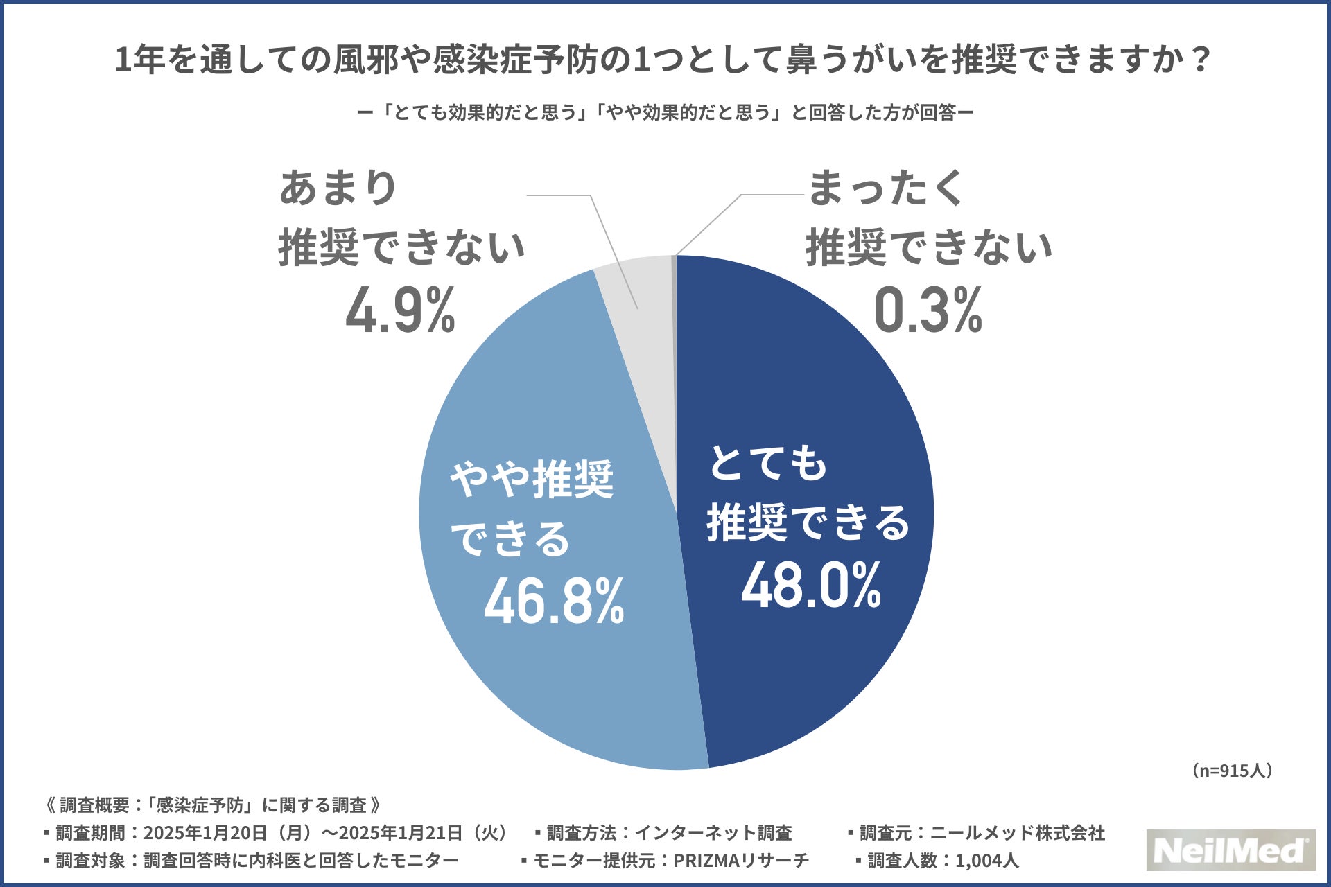 鼻うがいは風邪や感染症の予防策として年間を通じて推奨できるという肯定的な意見が9割以上と大多数を占めており、実践的な感染症対策として注目されています。
