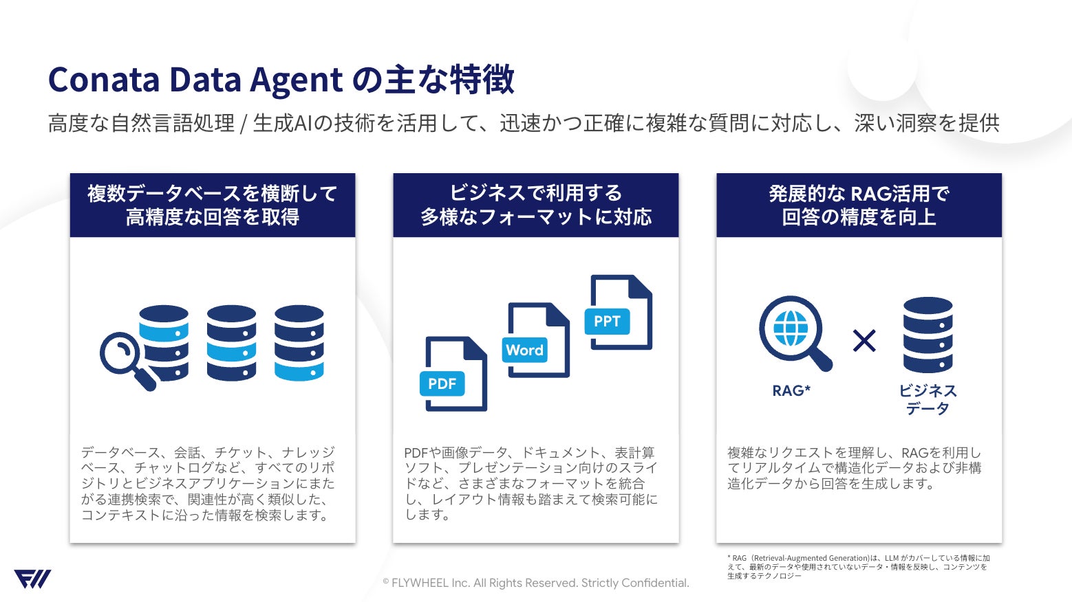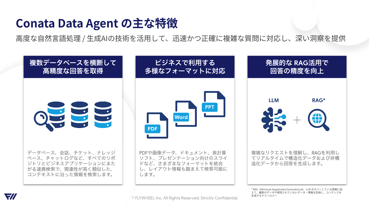 エンタープライズ企業のデータ活用を支援する株式会社フライウィール (本社:東京都港区、代表取締役:横山 直人 以下、フライウィール) は本日、企業内に眠った多種多様なデータと知見に基づいたAIが適切な情報を検索し、課題解決を支援するサービス、データ活用アシスタント Conata Data Agent を発表しました。専門知識やデータサイエンスの知識を必要とせず、誰でも簡単にデータを活用できる環境を提供します。