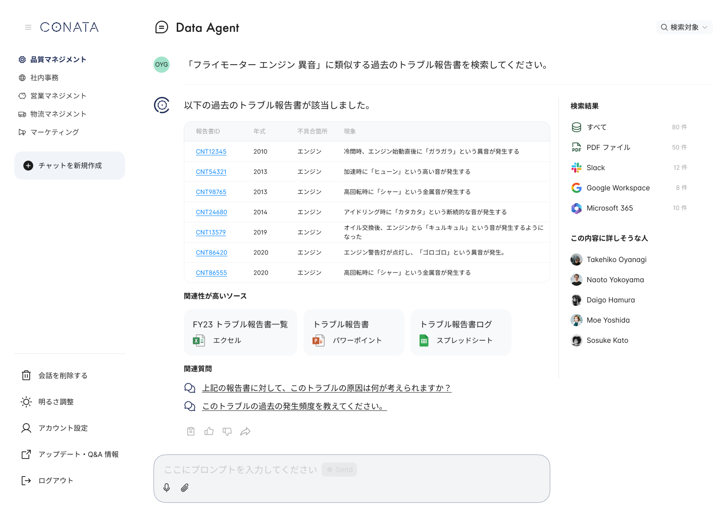 具体的には、過去のトラブル報告書や関連ドキュメントを横断的に検索し、類似事例や設計情報、事前検証結果を用いて、質問に対する回答を迅速に提示します。また、従来のデータ分析や社内検索エンジンでは得られなかった深い洞察や、対処方法などの示唆も含む回答が表示されることで、利用者の行動に対する意思決定を支援します。
