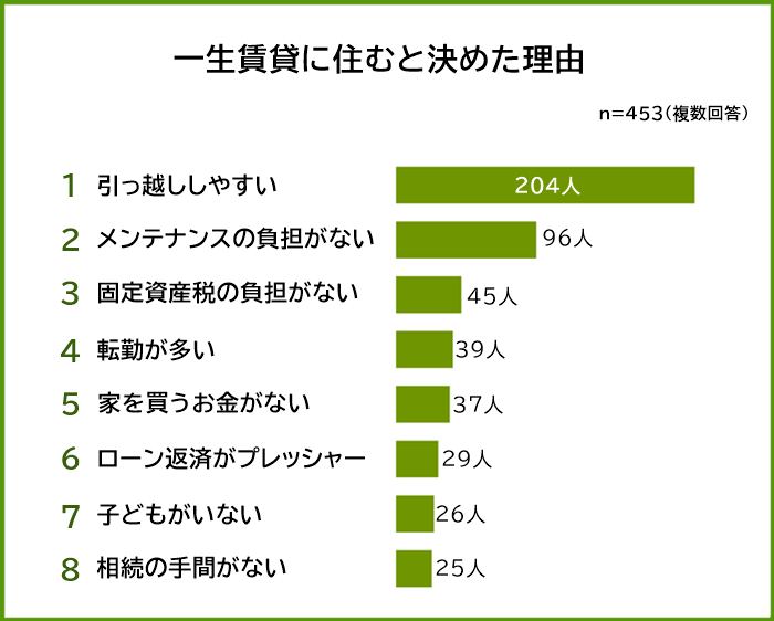 一生賃貸に住むと決めている453人を対象にアンケートを実施した結果、賃貸を選んだ理由としては「身軽さ」「コスト面の優位性」を挙げた人が多くなりました。
