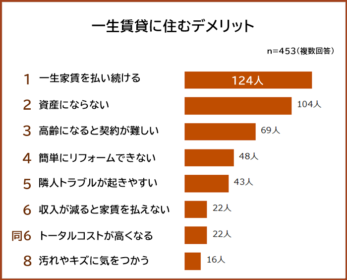 一生賃貸に住むと決めている453人に「一生賃貸に住むデメリット」を聞いたところ、1位は「一生家賃を払い続ける(124人)」でした。