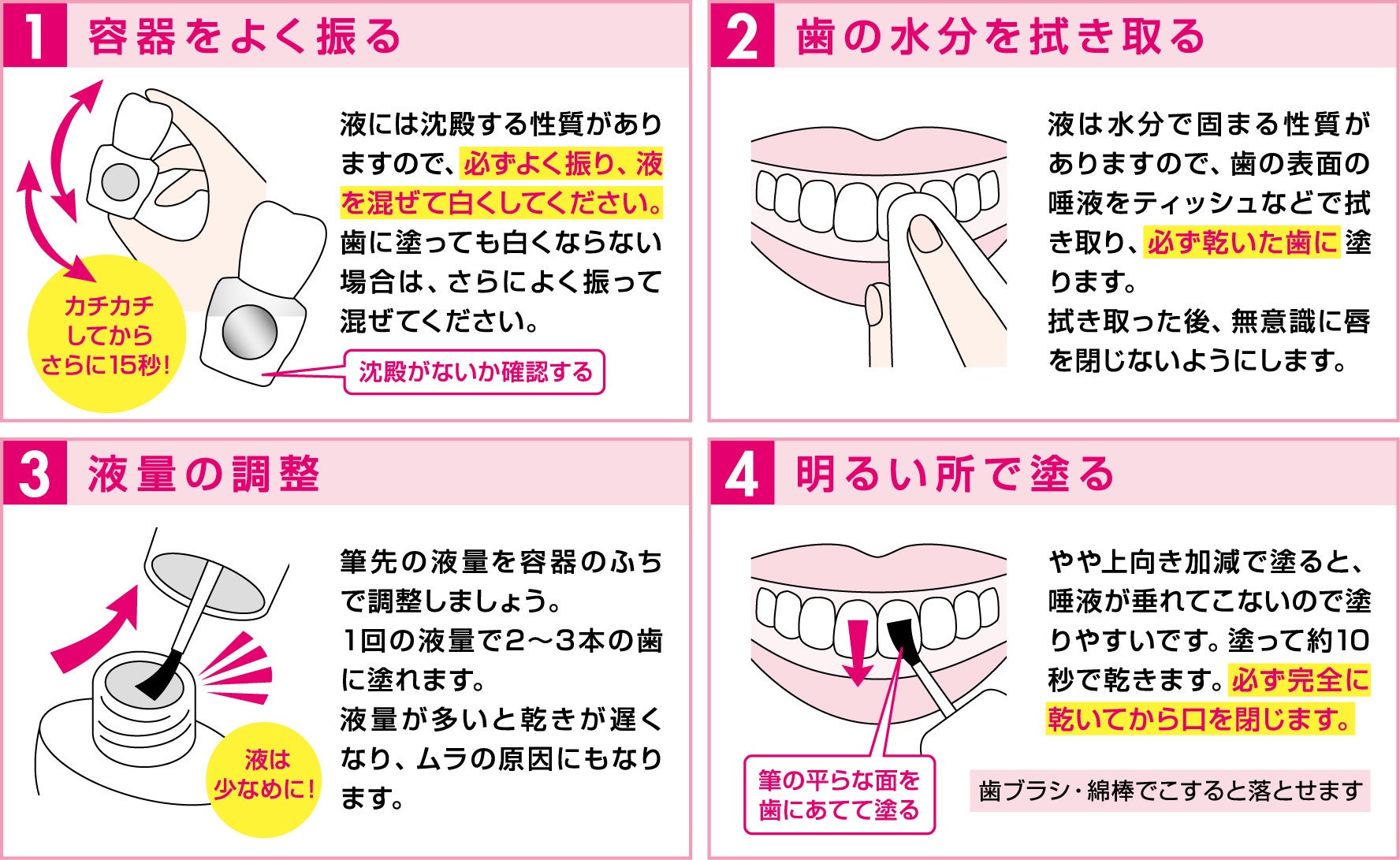 “歯のマニキュア”は、1964年に世界で初めて弊社が開発・商品化に成功して以来、60年間にわたり研究を積み重ねてまいりました。進化を続けた結果、現在は白い液剤を塗って約10秒で手軽に白い歯を実現でき、主成分は身体にやさしい食品に使用されている天然樹脂成分です。