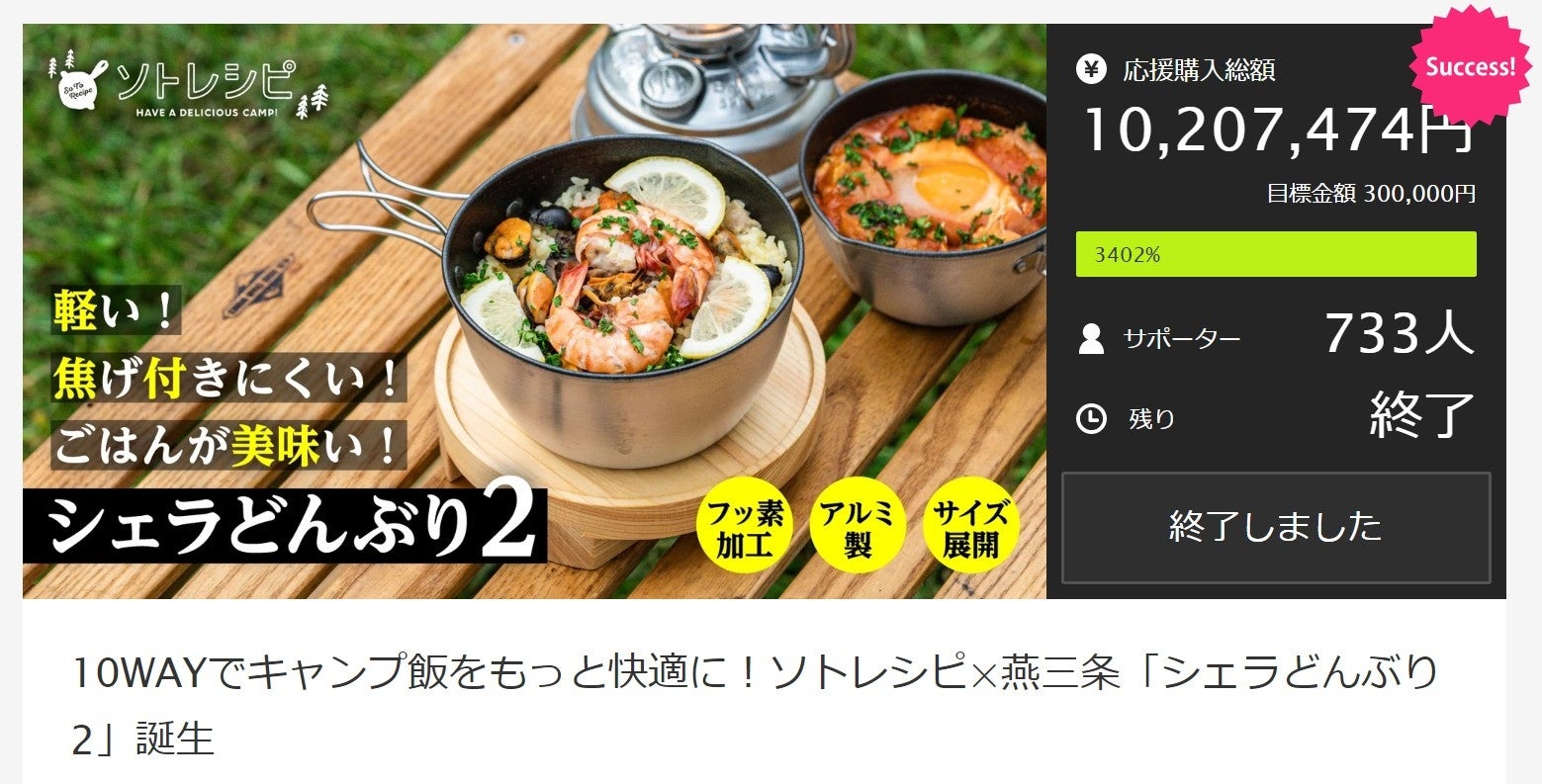 キャンプ飯レシピサイト「ソトレシピ(https://sotorecipe.com/)」を運営する株式会社ソトレシピ(本社:東京都渋谷区、代表取締役:千秋広太郎)は、アタラシイものや体験の応援購入サービス「Makuake(マクアケ)」にて2022年10月28日〜12月19日まで先行販売した『ソトレシピプロダクツ』の新商品「シェラどんぶり2」のクラウドファンディング応援購入金額が1,000万円を突破いたしました。