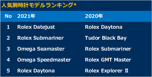 興味深いことに、高級クロノグラフの代表格であるRolex Daytona(デイトナ)は、2020年の1位から今年は5位に転落しました。