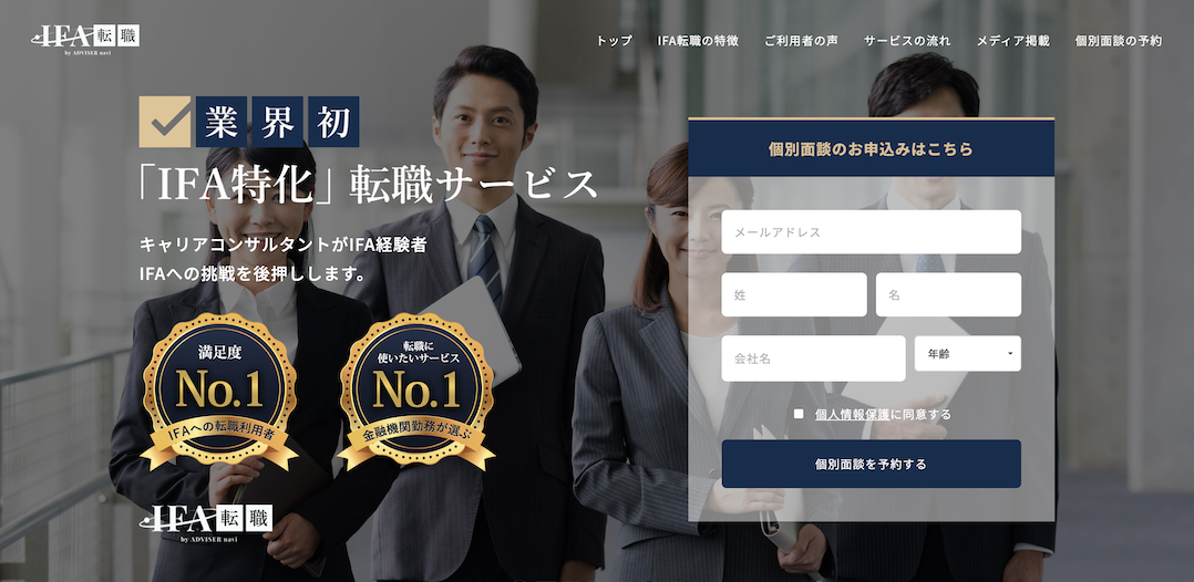 「IFA転職」は、証券会社出身の当社キャリア・アドバイザーが、独立系ファイナンシャルアドバイザー(以下IFA)に転職・転身されたい方のご要望や疑問点、不安点にきめ細かにお応えすることを強みとしております。