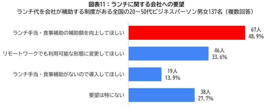 - 「食事補助制度」への要望として最も多かったのが「補助額の向上(48.9%)」。「リモートワークでも利用可能な形態への変更(33.6%)」