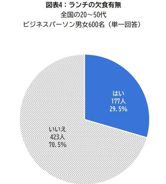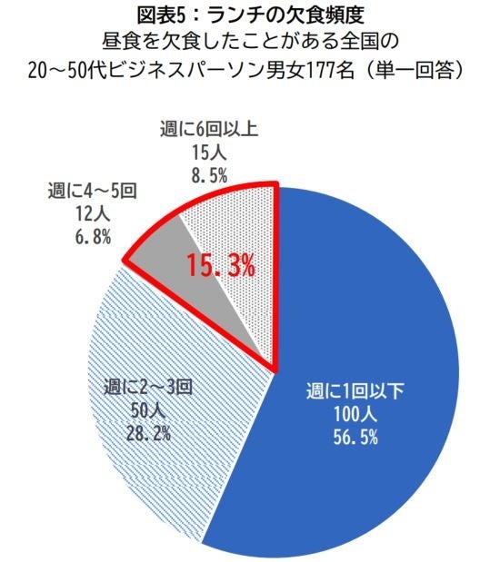 - 3人に1人が勤務日にランチを食べなかったことがある。約15%の人は週の半分以上ランチを食べていない