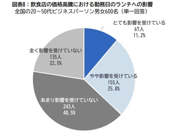・勤務日のランチにその影響を受けると回答した人は約4割だった。メニュー価格を引き上げる飲食店がさらに増加すると、今後節約を強いられる人もより増える可能性がある。