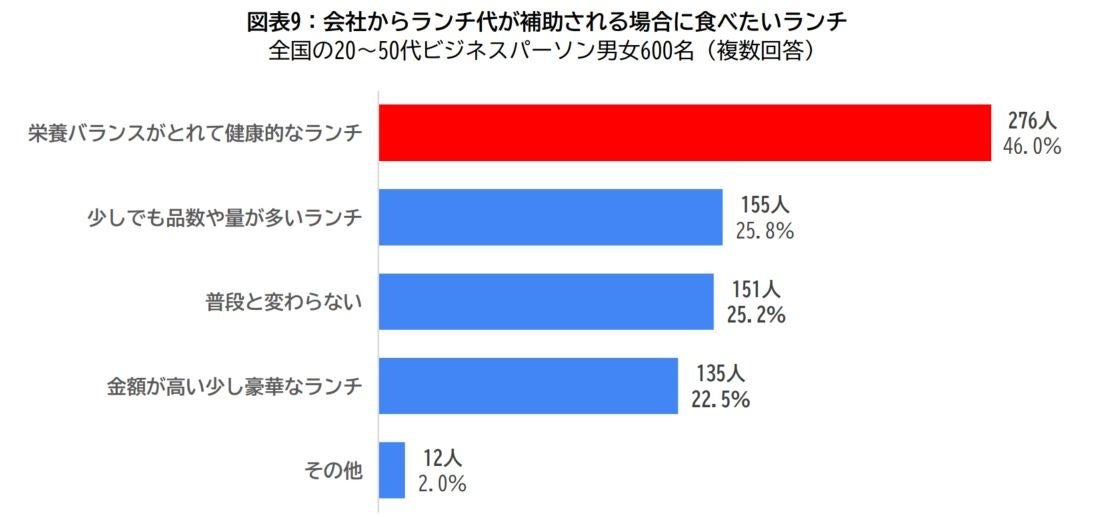 - 会社がランチ代を補助した場合に食べたいランチ。第1位は「栄養バランスがとれて健康的なランチ(46.0%)」